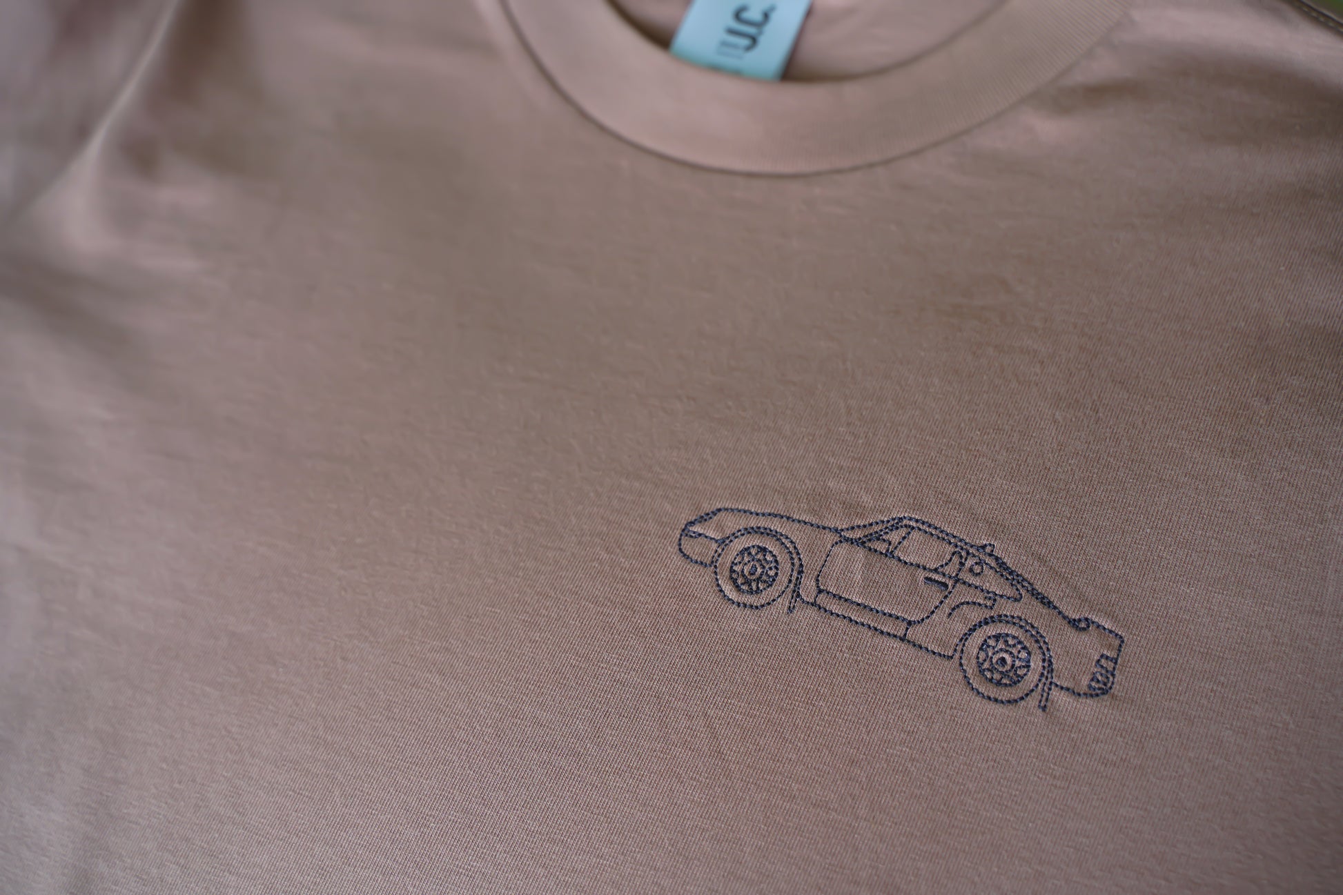 Minimalist Embroidery: Clean line-art stitching of the Porsche 959 offers a subtle nod to automotive design, reimagined with effortless style.